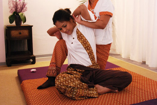 Die traditionelle Thaimassage „Nuad Phaen Boran“ ist eine über 2500 Jahre alte Heilkunst. Durch Verbindung von sanften Dehnbewegungen (passivem Yoga), Akupressur, Energieaktivierung und Meditation werden die Muskeln entspannt, die Gelenke entlastet, der Lymphfluss angeregt und die Atmung vertieft. Die traditionelle Thaimassage geht über eine rein körperliche Behandlung hinaus, indem sie für ein ganzheitliches Wohlbefinden von Körper, Geist und Seele sorgt. Die Thaimassage findet bekleidet statt und es wird traditionell kein Öl verwendet. Gerne stellen wir Ihnen bequeme Kleidung kostenlos zur Verfügung.